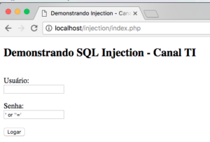 Para conseguir ‘burlar’ a validação simulando assim um ataque SQL Injection, utilize no campo senha: ' or ''='
