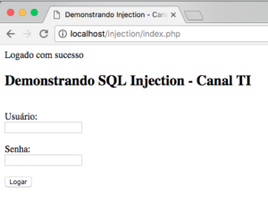 Após clicar em logar, é dado a mensagem: “Logado com sucesso”, validando o SQL Injection.